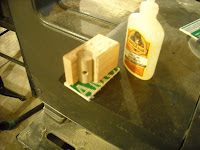 I tested the clacker with a small piece of vinyl and I got the sound I was looking for. I won't mount the vinyl until the very end though. I glued and clamped the center hull to one side of the tracks and let it cure overnight. I painted the inside areas that I would not be able to get at once the tank was assembled. (I also gave that area a quick spray acrylic seal.) Then I put in the axles and glued and clamped the other track side to the hull.